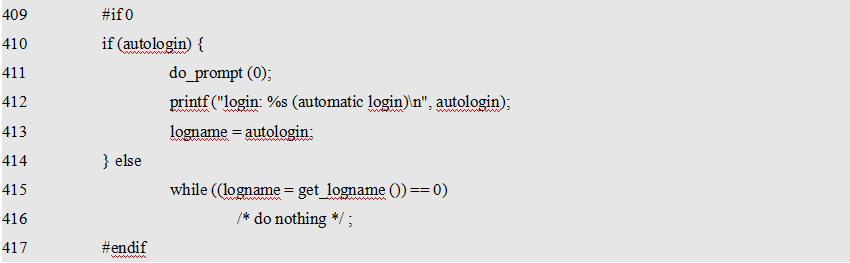 同時(shí),把mingetty.c文件中的第409~415行注釋掉,修改如下: