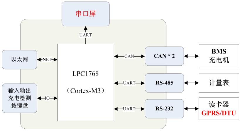 方案一,Cortex ?-M3主控+串口屏,應(yīng)用編程簡單,技術(shù)難度低,能夠滿足充電控制與人機交互的基本需求。 隨著移動支付與物聯(lián)網(wǎng)、車聯(lián)網(wǎng)發(fā)展,串口屏方案的不足也逐步凸顯,如人機界面設(shè)計靈活低、移動支付接入困難等。同時,Cortex ?-M3運行裸機程序,通過串口擴展無線DTU的方式,數(shù)據(jù)傳輸速度慢、成本高。