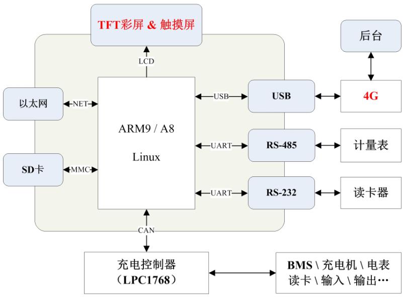 方案二,Linux主控+TFT彩屏。該方案保留Cortex ?-M3做為充電控制器主控(實時性需求),將顯示、數(shù)據(jù)管理、聯(lián)網(wǎng)通信、支付等功能在Linux系統(tǒng)下實現(xiàn)。技術(shù)難度略高于單Cortex ?-M3方案(軟件代碼方面),成本與Cortex ?-M3持平(雖然增加了Linux硬件的成本,TFT裸屏的價格則相對于串口屏降低)。