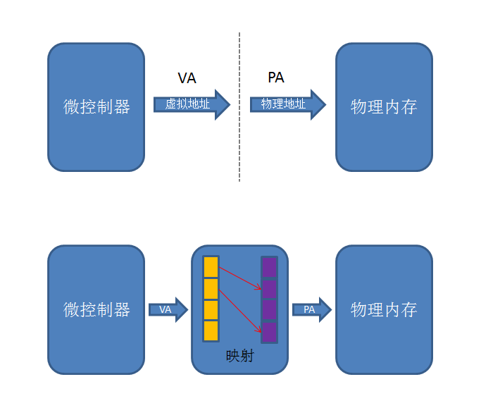 任何微控制器都存在一個程序能夠產(chǎn)生的地址集和,被稱為虛擬地址范圍。以32為機為例,虛擬地址范圍為0~0xFFFFFFFF (4G)。當該控制器尋址一個256M的內(nèi)存時,它的可用地址范圍被限定為0x00000000~0x0FFFFFFF(256M)。在沒有MMU的控制器中,虛擬地址被直接發(fā)送到內(nèi)存總線上,以讀寫該地址下的物理存儲器。在擁有MMU的控制器中,虛擬地址首先被發(fā)送到MMU中,被映射為物理地址后再發(fā)送到內(nèi)存總線上。