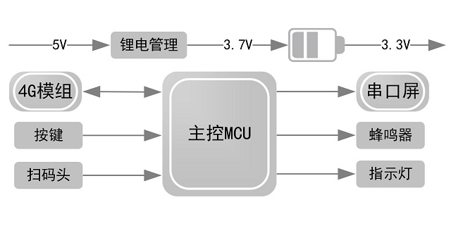傳統(tǒng)的手持掃碼器主要以通用MCU+4G通信模組+鋰電管理+掃碼頭模組+串口屏等構成,需要開發(fā)多個外設驅動,成本比較高!下面是傳統(tǒng)手持掃碼器通用產品框架圖: