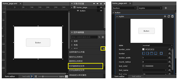 AWTK中每個(gè)窗體可以有自己獨(dú)立的窗體樣式文件,通過Designer新提供的快捷菜單,可以快速瀏覽和編輯該樣式文件。如果窗體沒有自己的窗體樣式文件,將使用全局樣式文件(default.xml)。