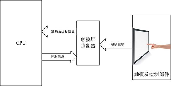 為了操作上的方便,人們用觸摸屏來代替鼠標(biāo)或鍵盤。如圖1所示,觸摸屏由觸摸檢測部件和觸摸屏控制器組成;觸摸檢測部件安裝在顯示器屏幕前面,用于檢測用戶觸摸位置,接受后送觸摸屏控制器;而觸摸屏控制器的主要作用是從觸摸點檢測裝置上接收觸摸信息,并將它轉(zhuǎn)換成觸點坐標(biāo),再送給CPU,它同時能接收CPU發(fā)來的命令并加以執(zhí)行。