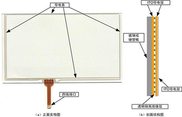 電阻類觸摸屏的關(guān)鍵在于材料科技,常用的透明導(dǎo)電涂層材料有:氧化銦(ITO)、鎳金涂層等。