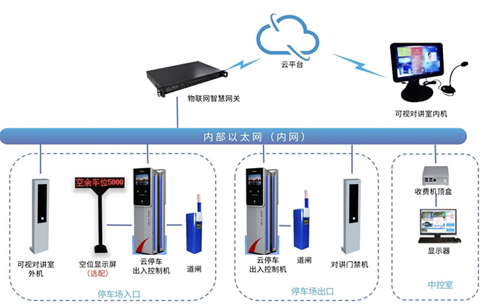 智慧停車場(chǎng)設(shè)備,可以分成出入口設(shè)備、停車場(chǎng)車位檢測(cè)設(shè)備、繳費(fèi)或?qū)ぼ囋O(shè)備。其中,出入口設(shè)備逐步采用一體機(jī),其集成了控制機(jī)、道閘、車牌識(shí)別攝像機(jī)、補(bǔ)光燈、信息屏、交換機(jī)、車輛檢測(cè)器、停車場(chǎng)收費(fèi)軟件。單個(gè)車道只需要部署一臺(tái)一體控制機(jī),即可實(shí)現(xiàn)車牌識(shí)別輸入口功能。支持現(xiàn)金,二維碼主動(dòng)掃描或被掃,無車牌掃碼繳費(fèi),語音對(duì)講,電子發(fā)票等功能,可以達(dá)到無人值守崗?fù)さ墓δ?,出入口停車系統(tǒng)架構(gòu)如下: