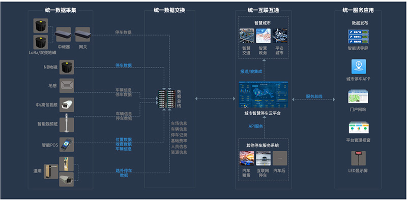 智慧停車系統(tǒng)整體架構(gòu)可以分成 4 層:數(shù)據(jù)采集層、數(shù)據(jù)交換層、云平臺(tái)/服務(wù)器、APP 應(yīng)用,如下圖: