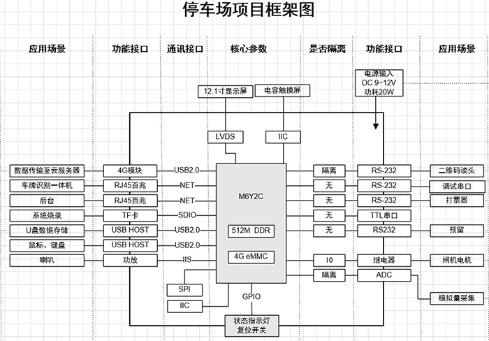 由于智慧停車系統(tǒng)本地需要支持?jǐn)?shù)據(jù)庫(kù),QT 瀏覽器,以及大屏幕視頻播放,M6Y2C核心板+車牌識(shí)別槍成為很合適的方案。該方案具備較高的性價(jià)比及集成度,框圖如下: