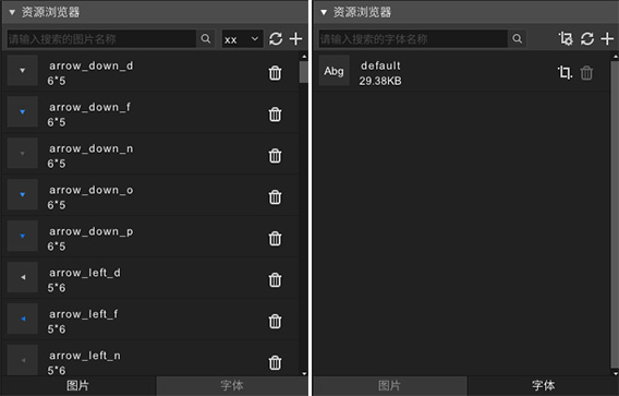 資源瀏覽器界面可快速添加、刪除圖片以及裁剪字體。