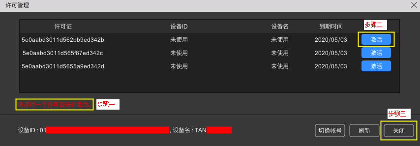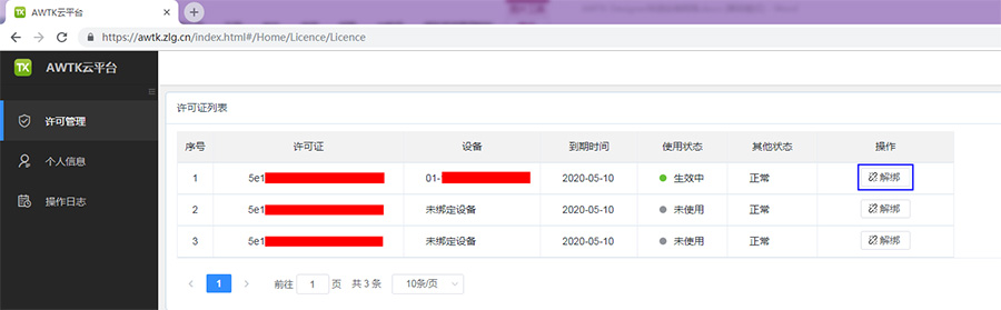 在許可管理頁(yè)面可以查看許可證、許可證綁定的設(shè)備、到期時(shí)間、使用狀態(tài)等。默認(rèn)一個(gè)許可證只能在一個(gè)設(shè)備(如電腦)上使用,如果需要在另外一臺(tái)設(shè)備上使用同一個(gè)許可證,請(qǐng)點(diǎn)擊下圖中的“解綁”按鈕進(jìn)行解綁,如圖1.15所示。