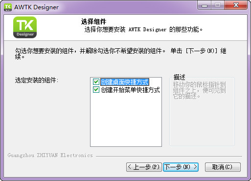 選擇要安裝的組件,如:是否創(chuàng)建桌面和開(kāi)始菜單快捷方式。選擇好之后,點(diǎn)擊“下一步(N)”按鈕,繼續(xù)安裝,如圖1.3所示。
