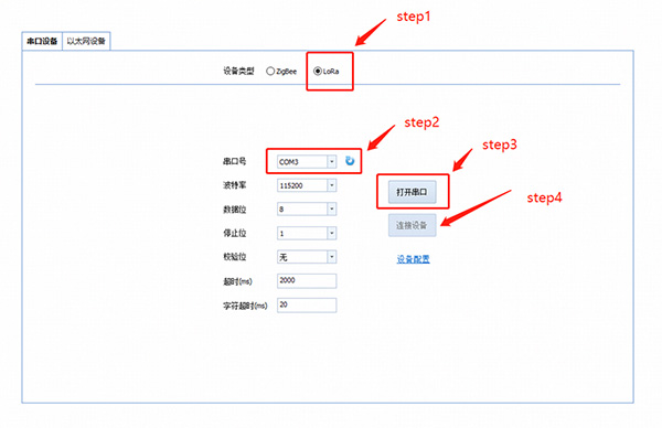 選擇1塊評估板1,通過USB轉(zhuǎn)串口接口與PC連接,打開WirelessCfg配置工具,選擇LoRa設(shè)備類型,選擇正確的串口號,打開串口后連接設(shè)備即可。
