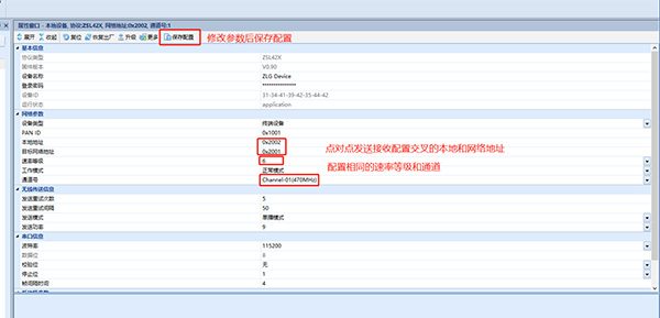要使用評估板實現(xiàn)簡單的點對點通信,只需要將兩個節(jié)點的本地地址與目標地址交叉,并為他們配置相同的速率等級和通道號,修改后保存配置即可??蓞⒖枷聢D配置進行修改后保存。