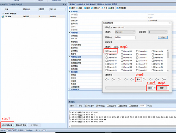 配置成功后,將評估板2上電,在配置工具中選擇添加遠程設(shè)備,通道和工作速率設(shè)置成與遠程設(shè)備一致,設(shè)置合適的搜索時間,最后點擊搜索即可查詢到在線的遠程設(shè)備。