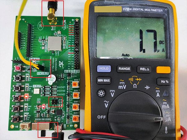 評估板預(yù)留有電流測試接口,將萬用表或者電流探頭接入電流測試接口即可測量芯片的電流消耗,以休眠電流為例,將跳線帽拔出后,按下休眠按鍵進入休眠模式,即可測量休眠電流,實測總消耗電流1.7uA。