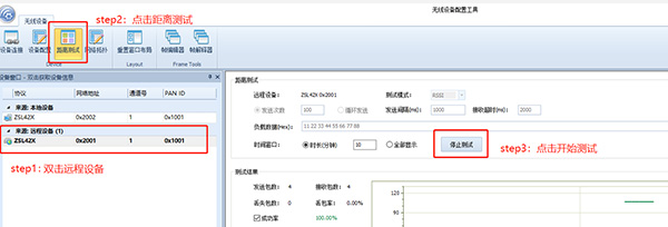 在WirelessCfg配置工具的距離測試功能中,可以對兩個節(jié)點進行拉距測試,開始測試后會持續(xù)收發(fā)數(shù)據(jù),配置工具中將記錄發(fā)包數(shù)、收包數(shù)等信息。