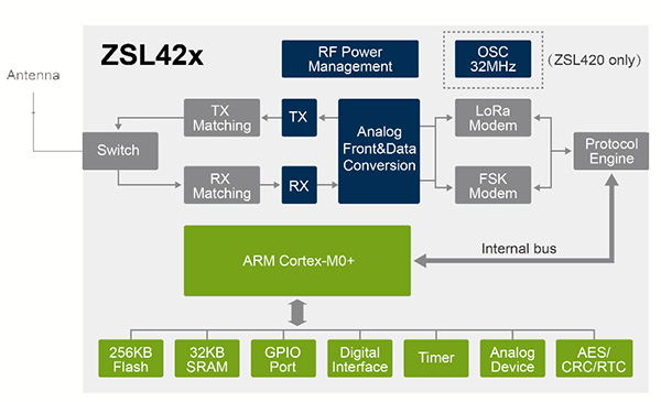 ZSL42x系列是致遠電子自主研發(fā)的LoRa智能組網(wǎng)芯片。該產(chǎn)品集成無線收發(fā)器,超低功耗MCU,射頻收發(fā)匹配電路和濾波電路。支持自組網(wǎng)透傳協(xié)議、LoRaNET、LoRaWAN、LinkWAN、CLAA等軟件組網(wǎng)協(xié)議。且芯片支持二次開發(fā),擁有256K字節(jié)Flash,32K字節(jié)SRAM,45個通用IO口,多個SPI,IIC,UART數(shù)字接口,內(nèi)置ADC,DAC等模擬外設(shè),支持AES-256硬件加密。