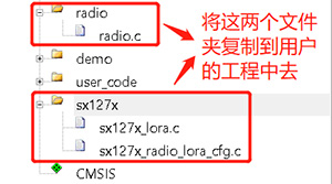 在該驅(qū)動例程中,前三個文件夾:startup、core、soc與具體用戶的MCU相關(guān),不用移植。Demo文件夾下面放的是致遠(yuǎn)電子提供的例程代碼,用戶可以選擇性移植。User_code文件夾下存放用戶的應(yīng)用程序,可以不用移植。真正且必須移植的是radio和sx127x這兩個文件夾下面的代碼,這兩個文件夾下包含的是驅(qū)動和配置代碼。