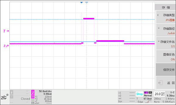 在測量模組正常工作模式的發(fā)射電流時,由于信號發(fā)射所需要的時間很短,整個電流是處于變化狀態(tài),我們稱之為動態(tài)電流。萬用表響應(yīng)時間比較慢,很難捕捉到變化的電流,所以不能使用萬用表測量,對于變化電流,需要使用示波器和電流探頭進(jìn)行測量,測量結(jié)果如下圖 2。