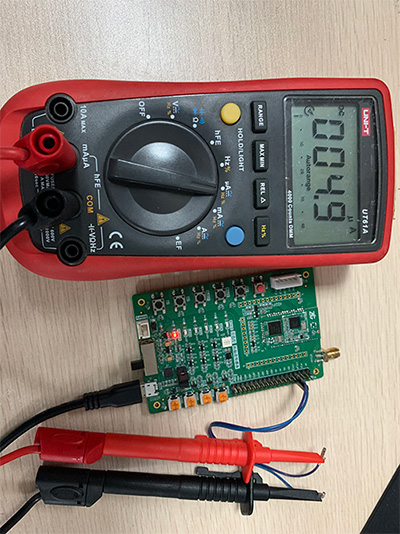 無線模組的功耗測試主要在測量電流,這里又分為靜態(tài)電流與動態(tài)電流兩種不同的測試。在模組處于休眠或者待機(jī)狀態(tài)時,由于電流不變化,保持一個靜止的數(shù)值,我們稱之為靜態(tài)電流。這時候我們可以采用傳統(tǒng)的萬用表來進(jìn)行測量,只需要在電源引腳串聯(lián)一個萬用表就可以得到所需要測量的數(shù)值,如圖 1所示。