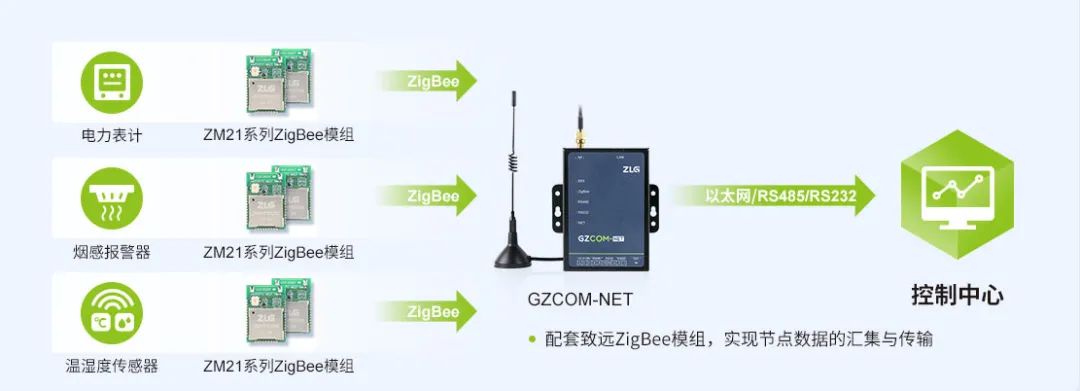 致遠電子ZM21系列Zigbee無線模組具有穩(wěn)定性高,組網(wǎng)方便快捷的特點,可配備在每個照明燈具控制器上,與GZCOM-NET Zigbee網(wǎng)關(guān)組成通信網(wǎng)絡,同時GZCOM-NET網(wǎng)關(guān)可以將Zigbee信號轉(zhuǎn)換成以太網(wǎng)信息,直接將燈具的實時狀態(tài)上傳到服務器。服務器也可通過網(wǎng)絡下發(fā)控制信息,來分組分區(qū)調(diào)節(jié)、控制各個照明燈具。