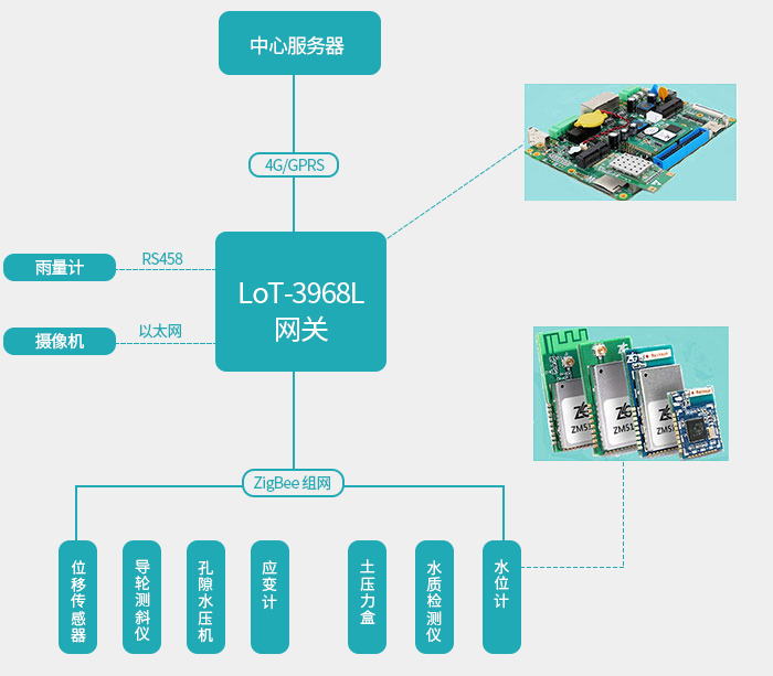 大壩安全監(jiān)測(cè):大壩是水庫(kù)安全的核心點(diǎn),水庫(kù)的水災(zāi)基本是由大壩的崩潰引起的。大壩在水流的沖擊侵蝕下,性能會(huì)受到影響。大壩的監(jiān)測(cè)項(xiàng)主要有變形、應(yīng)力、溫度、滲流量、揚(yáng)壓力和伸縮縫等,使用相關(guān)傳感器對(duì)大壩進(jìn)行監(jiān)測(cè),將數(shù)據(jù)通過(guò)zigbee上傳到zigbee網(wǎng)關(guān),并轉(zhuǎn)發(fā)到服務(wù)器進(jìn)行數(shù)據(jù)計(jì)算。系統(tǒng)圖片如下。