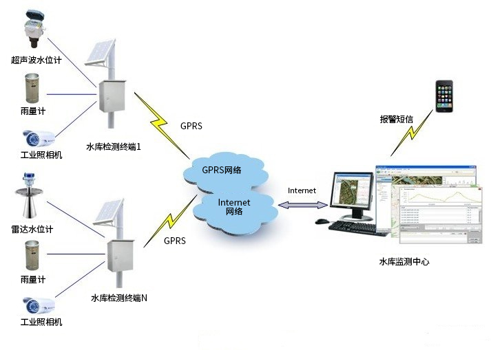 水庫(kù)安全監(jiān)測(cè)系統(tǒng)包括水量監(jiān)測(cè)和大壩安全監(jiān)測(cè)兩個(gè)部分。系統(tǒng)通過(guò)水位、攝像機(jī)、雨量、應(yīng)力等傳感設(shè)備,采集水庫(kù)的信息。采集設(shè)備通過(guò)zigbee將采集信息傳送到zigbee網(wǎng)關(guān),網(wǎng)關(guān)再將數(shù)據(jù)打包,通過(guò)GPRS/4G將信息傳送到服務(wù)器端,服務(wù)器進(jìn)行數(shù)據(jù)的運(yùn)算處理,實(shí)時(shí)監(jiān)測(cè)水庫(kù)的狀態(tài)。