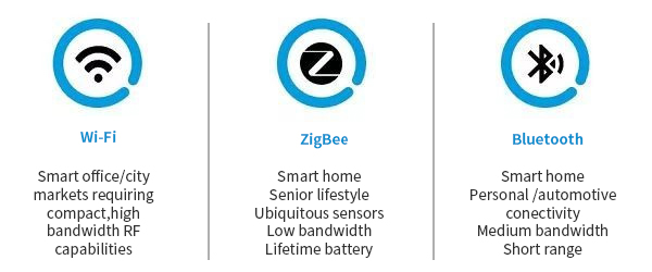 圖 2 Wi-Fi、ZigBee、Bluetooth適用場(chǎng)景與特點(diǎn)