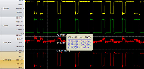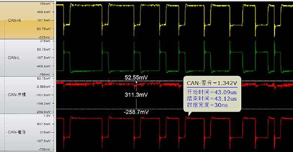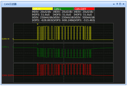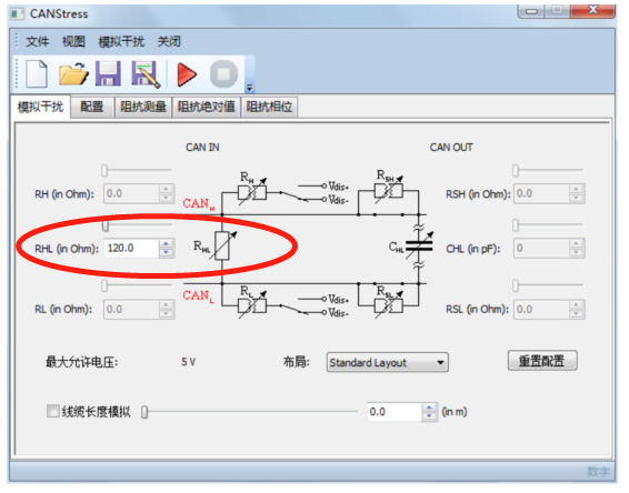 RHL 阻值設(shè)置完成后,單擊開啟紅色鍵或者進(jìn)入菜單點(diǎn)擊“模擬干擾”下面的開啟。之后返回 CAN 示波器,可通過查看 CAN 總線電平信號狀態(tài),判斷終端阻值是否匹配。