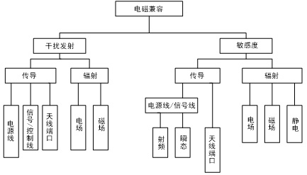電磁兼容主要有兩方面的內(nèi)容,一個是產(chǎn)品本身對外界產(chǎn)生不良的電磁干擾影響,稱為電磁干擾發(fā)射EMI;另一個是對外界電磁信號的敏感程度稱為電磁敏感度EMS。干擾源、相合途徑及敏感設備是電磁兼容的三要素,缺一不可。電磁兼容的詳細內(nèi)容如圖1所示。