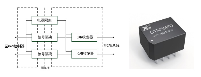 隔離是解決傳導干擾問題的理想方法,它具有良好的電絕緣能力和抗干擾能力。選擇隔離收發(fā)器首先要考慮傳輸延時,其延時時間對總線的傳輸距離和質(zhì)量都會造成影響,建議使用磁隔離的CTM5MFD設計接口收發(fā)電路。