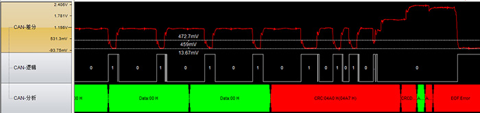 在網(wǎng)絡(luò)布局無(wú)法改變,分支引起的信號(hào)反射必須存在的情況下。最實(shí)用的方法就是在長(zhǎng)分支末端加上電阻,消除信號(hào)反射。同樣的在上述實(shí)驗(yàn)中,在分支節(jié)點(diǎn)處加上一個(gè)200Ω的電阻,其它條件不變進(jìn)行通信實(shí)驗(yàn)。下圖為實(shí)驗(yàn)的CAN波形圖,此時(shí)可以看到邊沿臺(tái)階已被消減,但是加了電阻之后差分電壓變小,注意差分電壓不得小于0.9V。這里值得一提的是:阻值大于500Ω的電阻吸收反射的能力很弱,所以在末端掛電阻的時(shí)候應(yīng)小于500Ω。