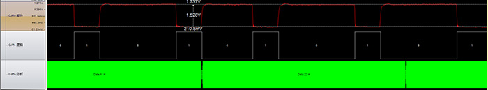 在CAN網(wǎng)絡(luò)布局的根源上解決問(wèn)題的方式就是減少CAN節(jié)點(diǎn)的分支長(zhǎng)度,從而降低信號(hào)反射,保證位寬的穩(wěn)定性。在上述實(shí)驗(yàn)中,其它條件不變,只將分支長(zhǎng)度減少為20cm;下圖為CAN波形圖,此時(shí)并沒(méi)有看到邊沿臺(tái)階的出現(xiàn)。由此可見(jiàn),減少分支長(zhǎng)度是消除邊沿臺(tái)階的最直接方式。