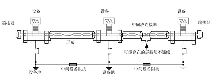 屏蔽層多點(diǎn)接地需要注意接地點(diǎn)電位,避免地回流影響信號(hào)質(zhì)量。若屏蔽層太長(zhǎng)可以采用分段屏蔽,單點(diǎn)接地方法,如下圖,就可以有效避免地回流的問(wèn)題。
