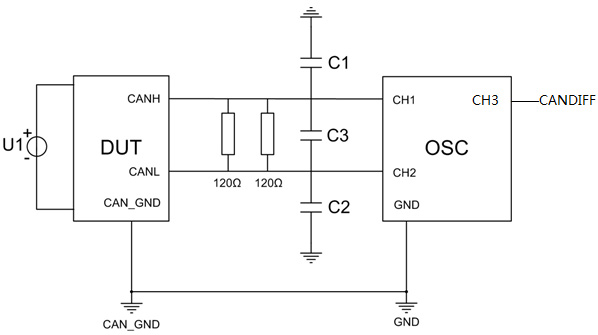 - 測(cè)試原理:測(cè)試原理如下圖,DUT往總線正常傳輸數(shù)據(jù)時(shí),傳輸?shù)臄?shù)據(jù)幀是顯性位和隱性位的序列,即傳的數(shù)據(jù)中包含了上升、下降時(shí)間信息;
