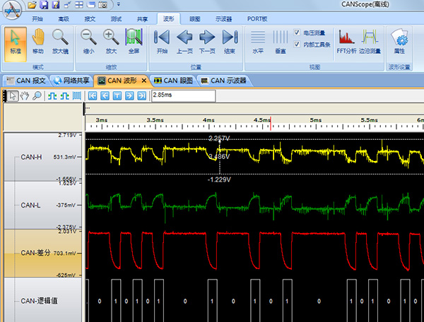 負(fù)載率過高,總線節(jié)點(diǎn)多,造成總線網(wǎng)線的分布電容很大,體現(xiàn)在下降沿非常緩,如圖4所示,顯性電平回到隱性電平需要的放電時(shí)間加大。對(duì)信號(hào)來說就是會(huì)縮短隱性電平時(shí)間,容易導(dǎo)致位錯(cuò)誤。