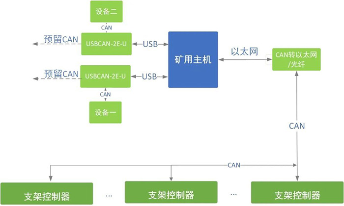 礦井?dāng)?shù)據(jù)通過(guò)CAN轉(zhuǎn)以太網(wǎng)或者光纖通訊,通訊的示意圖如下: