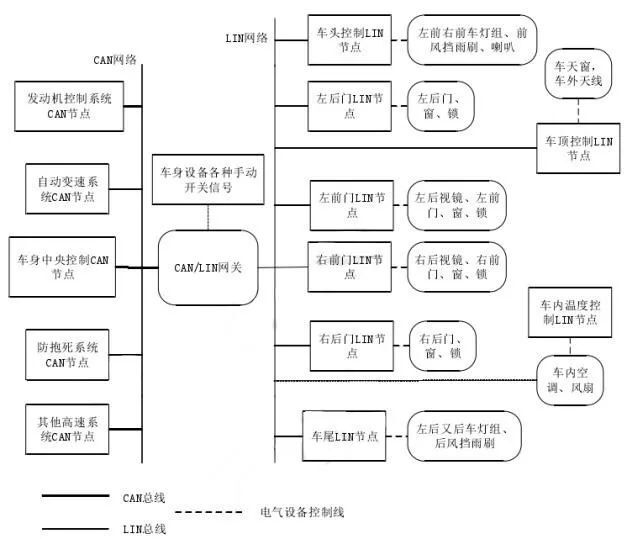 LIN的全稱為L(zhǎng)ocal Interconnect Network。其主要功能是為CAN總線網(wǎng)絡(luò)提供輔助功能,適用于對(duì)總線性能要求不高的車身系統(tǒng),如車門(mén)、車窗、燈光等智能傳感器、執(zhí)行器的連接和控制,如圖1所示,為L(zhǎng)IN總線在車身的應(yīng)用。LIN是面向汽車底端分布式應(yīng)用的低成本、低速率的串行通信總線,屬于局部互聯(lián)網(wǎng),是SAE規(guī)范的汽車A類網(wǎng)絡(luò)。