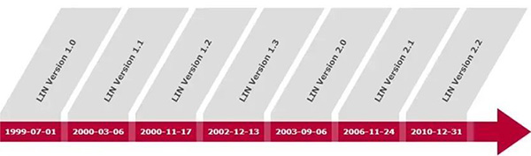 LIN聯(lián)盟成立于1999年,并發(fā)布了LIN1.0版本。最初的成員有奧迪、寶馬、克萊斯勒、摩托羅拉、博世、大眾和沃爾沃等,最新的為V2.2版。如下圖2為L(zhǎng)IN協(xié)議的發(fā)展史。