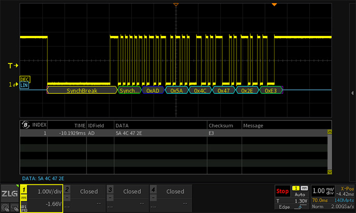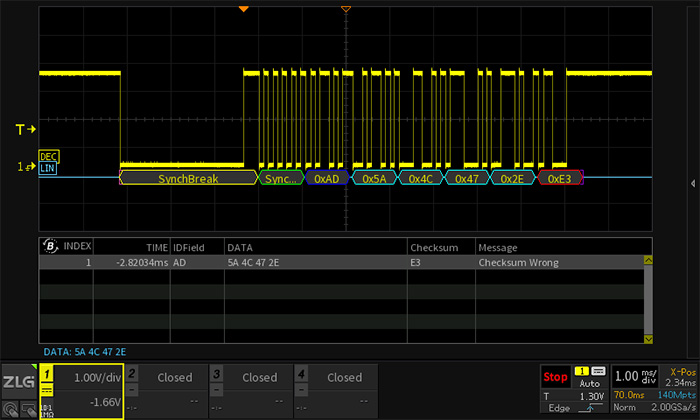 致遠(yuǎn)電子ZDS全系列示波器支持LIN1.3、LIN2.0協(xié)議全內(nèi)存解碼功能,現(xiàn)在使用ZDS5054Pro輸入一個(gè)LIN1.3信號(hào),使用LIN1.3和LIN2.0協(xié)議解碼會(huì)有什么樣的不同效果呢?如下圖4、圖5所示。