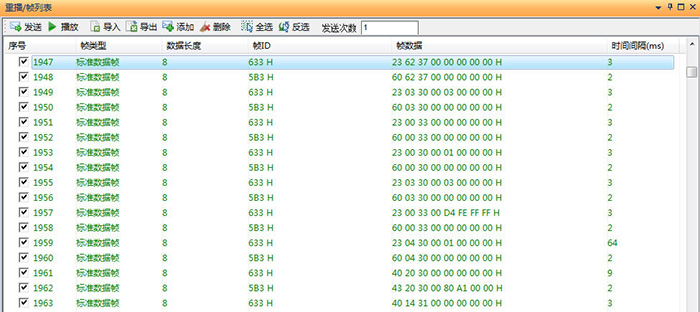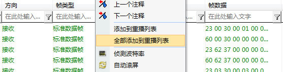 然后將報(bào)文添加到重播列表,將記錄的報(bào)文導(dǎo)入重播序列。如圖 7所示。