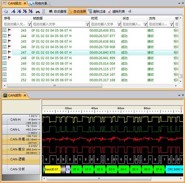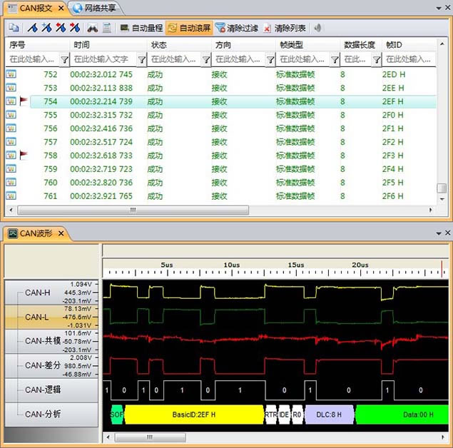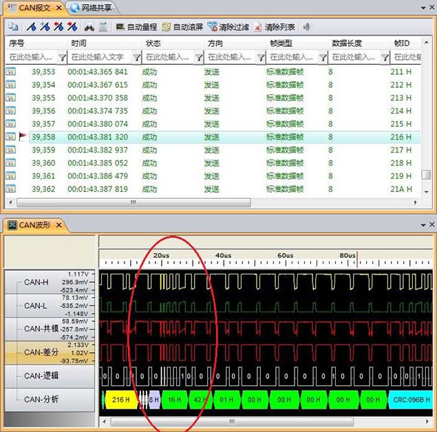 如下圖所示,滿足數(shù)據(jù)條件的報文和對應(yīng)波形被標(biāo)記出來。