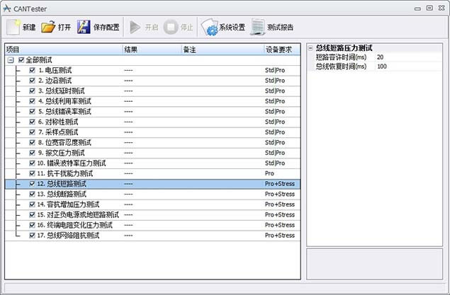 比如總線短路測試,CANScope可以模擬短路20ms(可自定義),然后檢測被測設(shè)備能否在100ms內(nèi)恢復,以此驗證被測設(shè)備是否有錯誤處理恢復機制。