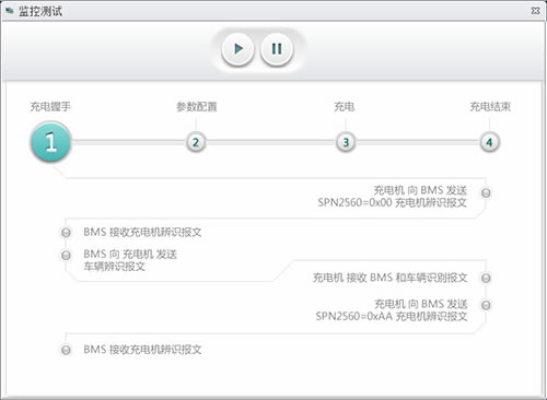 監(jiān)控測試啟動(dòng)后,界面中為四個(gè)充電過程的流程監(jiān)控圖,實(shí)時(shí)閃動(dòng)目前進(jìn)行的步驟。如果發(fā)生充電過程異常中斷,可以自動(dòng)提示目前中斷的位置,便于查找問題原因。如圖 4所示。