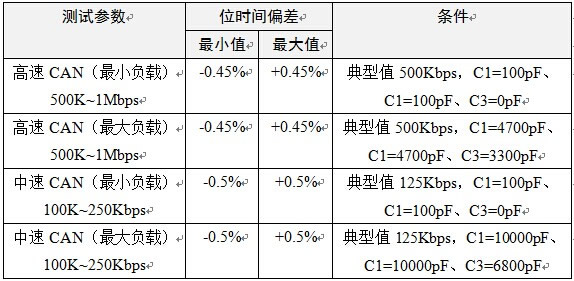 汽車CAN總線設(shè)計(jì)規(guī)范對(duì)于CAN節(jié)點(diǎn)的差分信號(hào)位時(shí)間(即波特率)有著嚴(yán)格的規(guī)定,同一總線上每個(gè)節(jié)點(diǎn)的信號(hào)位時(shí)間必須保持較高的一致性,否則節(jié)點(diǎn)組合到一起后,會(huì)導(dǎo)致錯(cuò)誤幀的出現(xiàn),各節(jié)點(diǎn)間無法進(jìn)行通信。具體要求如表 1所示,為汽車測(cè)試標(biāo)準(zhǔn)GMW3122信號(hào)位時(shí)間標(biāo)準(zhǔn)。
