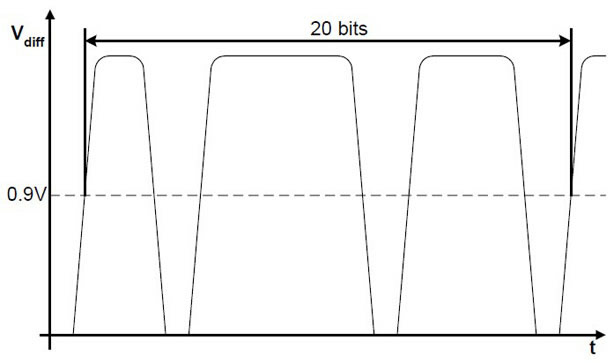 如表 1所示四種條件下,選擇被測(cè)DUT的適應(yīng)條件,使用示波器,通過測(cè)試DUT連續(xù)20-30個(gè)位的隱性-顯性差分電平的邊沿時(shí)間,平均計(jì)算出一個(gè)位的時(shí)間,并至少重復(fù)100次,確定最大和最小值。如圖 1所示。