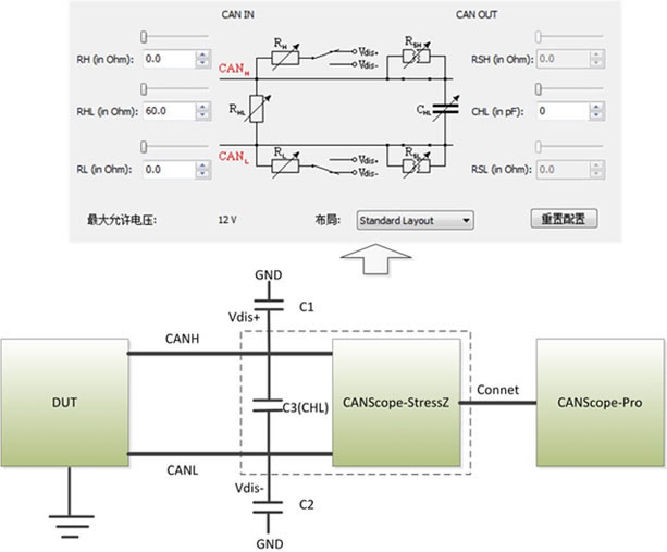 1. 使DUT上電后,能一直發(fā)送CAN報(bào)文,CANScope不勾選總線應(yīng)答,其黑色表筆(地)要和DUT的CAN收發(fā)器共地,如圖 2所示,配置Stress板的模擬干擾參數(shù),進(jìn)行測(cè)試系統(tǒng)的測(cè)試連接。