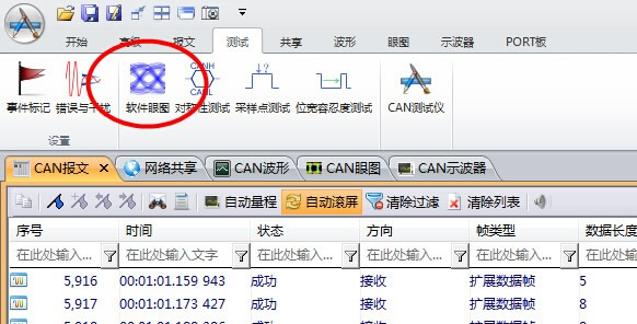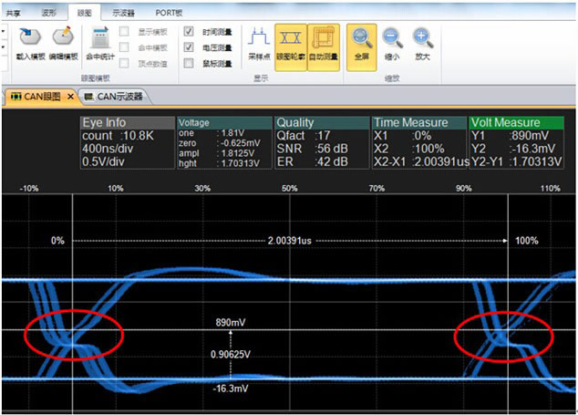 所以廣州致遠(yuǎn)電子有限公司改進(jìn)了測(cè)試方法,使用CANScope-Pro總線分析儀與CANScope-StressZ擴(kuò)展板組合后,采用比較先進(jìn)的眼圖統(tǒng)計(jì)方法,避免了人工統(tǒng)計(jì)的誤差,測(cè)試時(shí)間的浪費(fèi),且使大數(shù)據(jù)量統(tǒng)計(jì)測(cè)量得以實(shí)現(xiàn),提高了測(cè)試的準(zhǔn)確度,極大節(jié)約了人工成本。