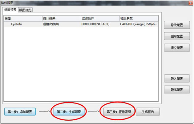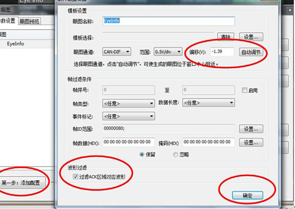 4. 在軟件眼圖界面中,先點(diǎn)擊第一步:添加配置。點(diǎn)擊自動(dòng)調(diào)節(jié),并且勾選過濾ACK區(qū)域?qū)?yīng)波形。點(diǎn)擊確定即可。如圖 5所示。然后點(diǎn)擊第二步:生成眼圖,等待完成后點(diǎn)擊第三步:查看眼圖。如圖 6所示。