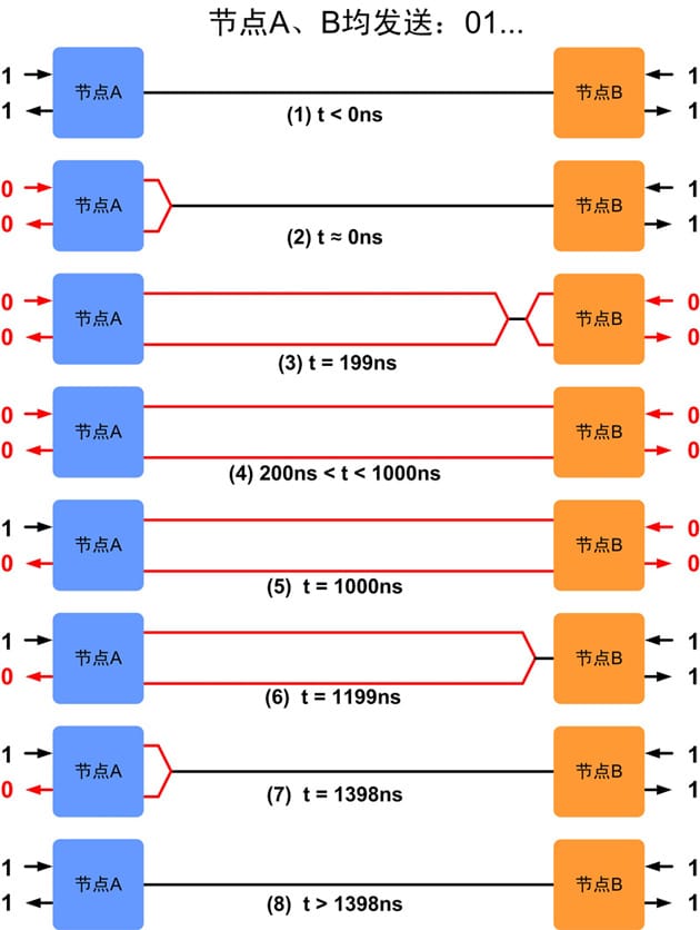 如圖1所示,節(jié)點(diǎn)A在時(shí)間t=0時(shí)開(kāi)始發(fā)送一條消息,從而在總線(2)上傳輸一個(gè)顯性位。有可能出現(xiàn)的情況是,節(jié)點(diǎn)B剛好在節(jié)點(diǎn)A的信號(hào)被接收到以前(3)開(kāi)始發(fā)送,也即時(shí)間t=199ns。當(dāng)時(shí)間t=1000ns,節(jié)點(diǎn)A第二位開(kāi)始之初,在節(jié)點(diǎn)A轉(zhuǎn)到隱性狀態(tài)以前(4)兩個(gè)節(jié)點(diǎn)都沒(méi)意識(shí)到對(duì)方的有效性。然后,節(jié)點(diǎn)B在時(shí)間t=1199ns的第二位開(kāi)始之初(6),轉(zhuǎn)到隱性狀態(tài)。另一個(gè)單向延遲以后,該隱性電平才到達(dá)節(jié)點(diǎn)A,時(shí)間 t=1399ns(8)。只有在這時(shí),節(jié)點(diǎn)A才能讀取RXD信號(hào),并且可以確定其代表總線的真實(shí)狀態(tài)。