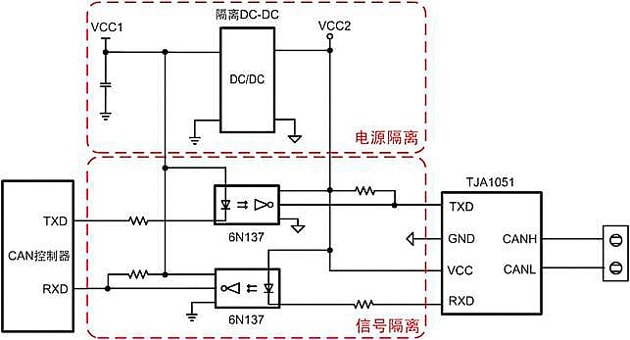 若采用圖2的隔離方案,光耦6N137具有典型的60ns單向延時(shí),而全部雙向信號(hào)必須經(jīng)過(guò)4個(gè)光耦,加上單個(gè)TJA1051約120ns的典型循環(huán)路延時(shí),總的循環(huán)延時(shí)達(dá)到480ns。在位時(shí)間配置不變的情況下, 1Mbps速率實(shí)際只能傳輸約17m的距離,這樣大大地縮短了CAN系統(tǒng)的容許線纜長(zhǎng)度。